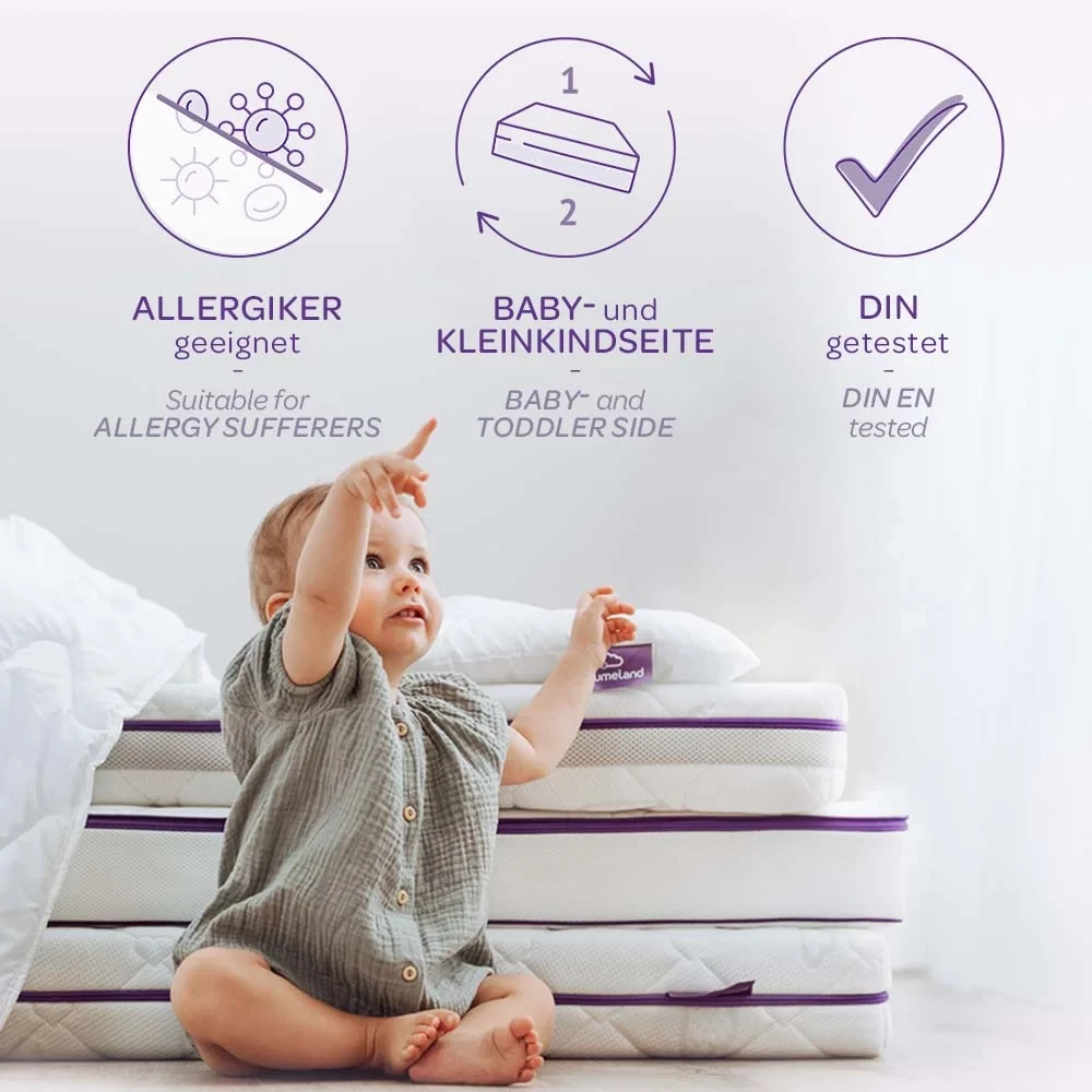 Die Babymatratze WIND – BETTER DREAMS EDITION wurde speziell für die Bedürfnisse Ihres Babys entwickelt. Sie kombiniert sanfte Stützkraft mit einer luftigen, atmungsaktiven Struktur, damit Ihr kleiner Schatz sicher und entspannt schlafen kann.