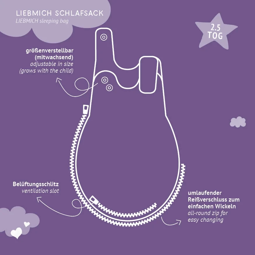 Die beiden Belüftungsschlitze am Schlafsack können durch Reißverschlüsse geöffnet werden und ermöglichen eine optimale Luftzufuhr je nach Bedarf. Innerhalb von 5 Minuten reduziert sich so die Temperatur um bis zu 3°C. Einer Überwärmung des Babys wird so entgegengewirkt.