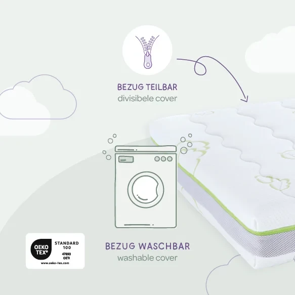 Der Matratzenbezug aus 100 % KBA-Bio-Baumwolle aus kontrolliert biologischem Anbau ist luftdurchlässig, waschbar bis 40 °C und für den Schontrockner geeignet.