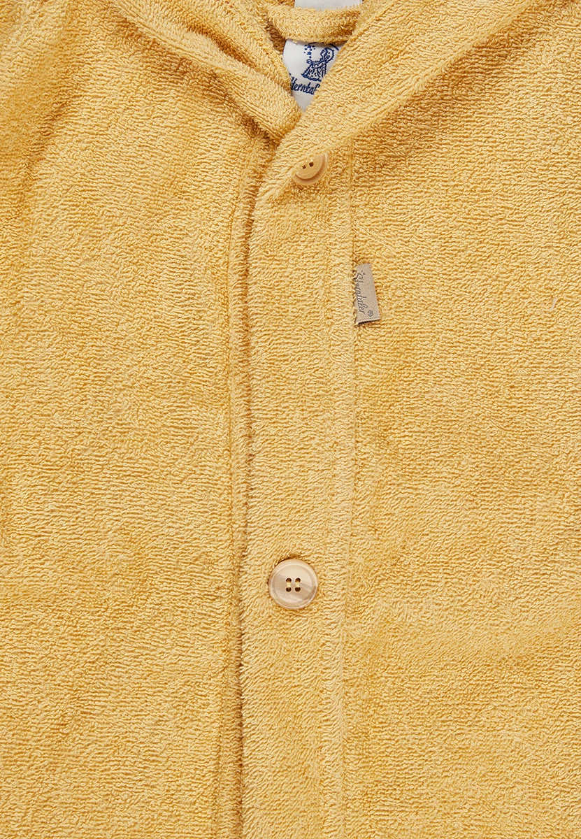 Die angenähte Kapuze schützt das Köpfchen vor Zugluft, während der Bindegürtel und die praktischen Taschen für Komfort und kindgerechte Funktionalität sorgen.