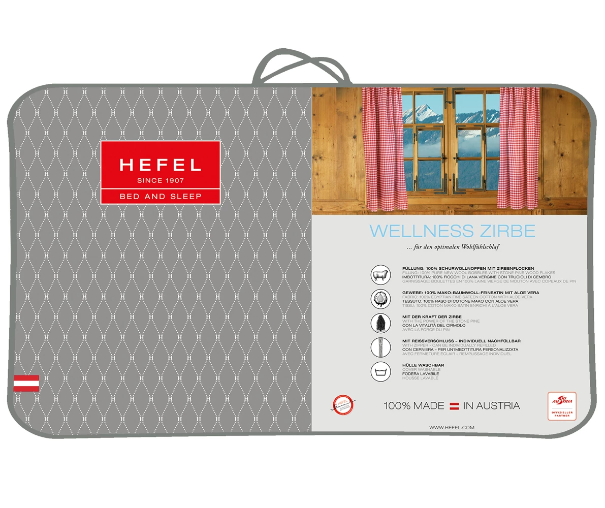 Das Gewebe wird aus 100% Baumwoll-Satin gefertigt, die Hülle wird abgesteppt mit 100% Schurwollvlies, die Füllung besteht aus HEFEL-Schafschurwollnoppen und Zirbenflocken.