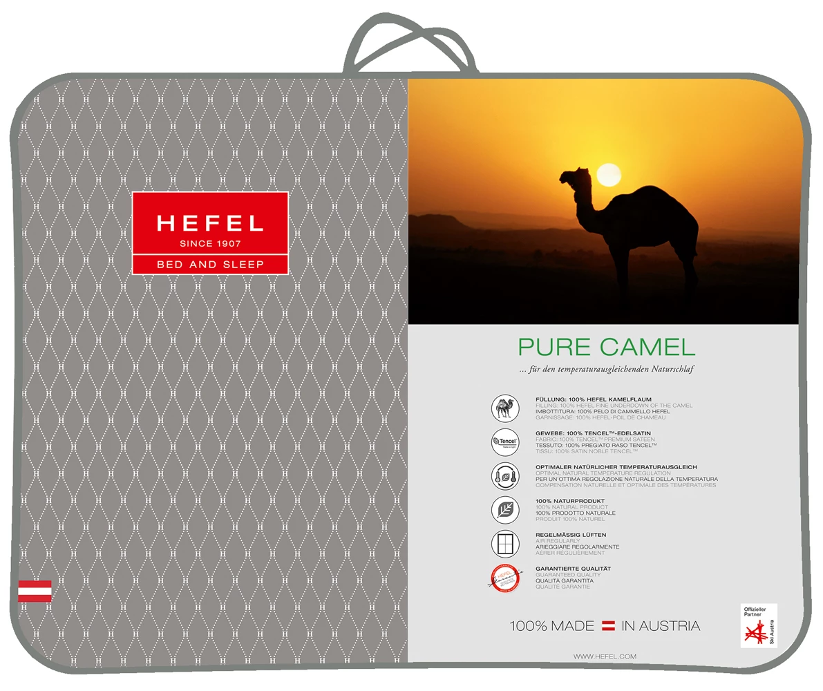 Kamele müssen in der Wüste Temperaturschwankungen bis zu 60°C aushalten. Deren Fell erfüllt also eine wichtige Funktion, diese enormen Temperaturschwankungen auszugleichen. Einerseits wärmt es gut, es schützt aber auch vor der Hitze und ist vor allem atmungsaktiv. Das Gewebe aus 100% Tencel verstärkt diesen Effekt sogar noch. In den HEFEL Pure Camel Bettdecken wird ausschließlich das zarte Flaumhaar mongolischer Kamele verwendet.