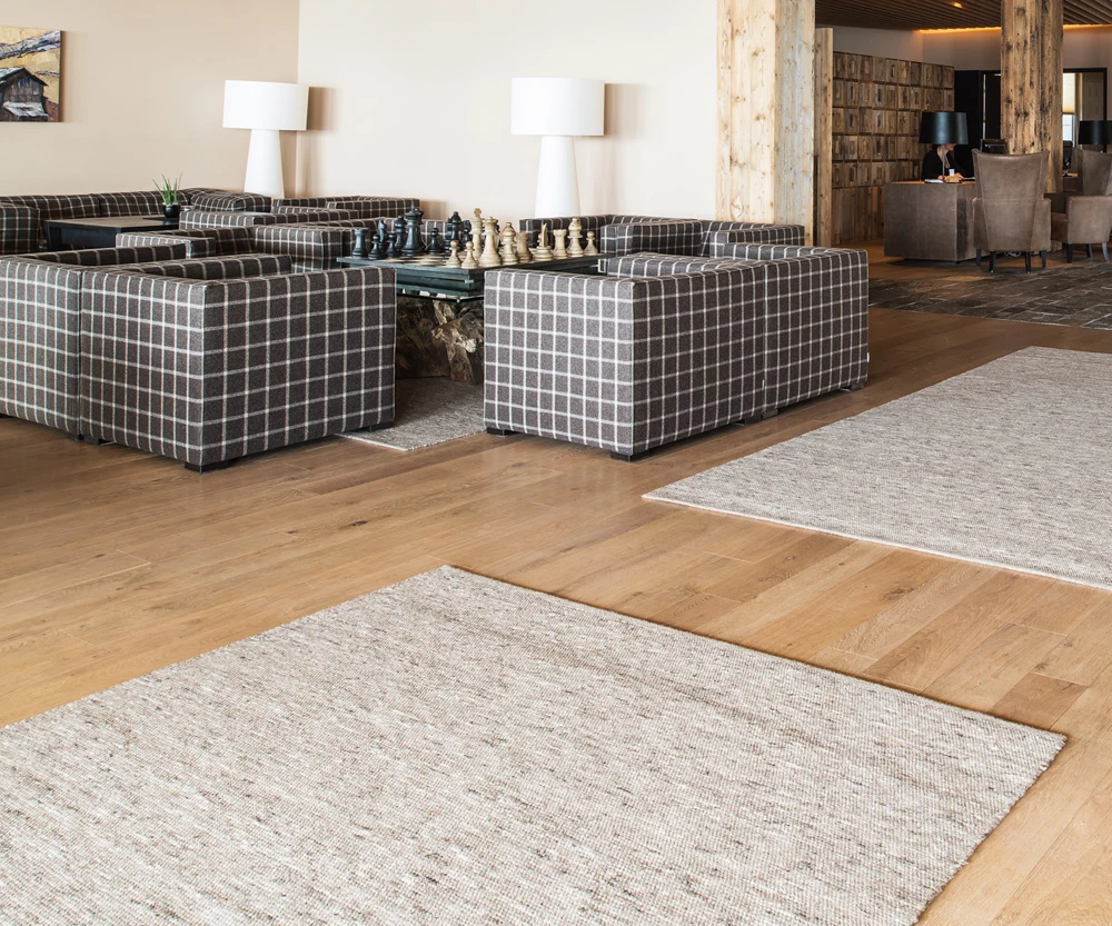 Der Schurwollteppich Stockholm ist der Moderne unter den Schafwollteppichen. Als Vorleger für einen geradlinigen Kachelofen oder im Design Wohnzimmer ist er der perfekte Begleiter.